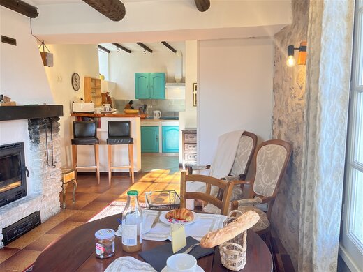 Der freigelegte Naturstein verleiht dem Wohnraum seinen gemütlichen Charme. Vom Eßtisch aus haben Sie einen traumhaften Blick über das Dorf, hin zum Berg, dem „Mont Ventoux“, ein wunderbares Wandergebiet und ein Mekka des Radsports. Dieser Blick kann mit der Zeit süchtig machen. Unsere Gäste loben immer wieder die gute Ausstattung der Küche, die im hinteren Teil des Raumes liegt. Das hell und freundlich geflieste Badezimmer mit Dusche, Waschtisch und WC liegt auch auf der Wohnebene. Der Kamin mit Glasscheibe läßt sich ganz einfach bedienen und sorgt im Frühjahr und Herbst für mollige Wärme im ganzen Häuschen und Kaminromantik. Wir stellen Ihnen Kaminholz und Anzündeholz ohne Berechnung zur Verfügung. Eine Ebene höher liegt das heimelige Schlafzimmer mit sichtbarem Deckengebälk, Original-Terracottafliesen und dem Blick vom Bett aus auf den Mont Ventoux.