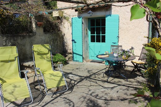 Unser „maison Lisa“ eignet sich besonders für 2 Personen, die  gerne 1 kleines Schlafzimmer für eine Person zusätzlich zum geräumigen  Doppelschlafzimmer haben möchten. Auch hier genießen Sie die Ruhe, den  Blick ins Grüne, über das Dorf auf die Hänge des Mont Ventoux und sind  doch in nur 2 Minuten mitten im Dorfleben. Die Terrasse bietet  ausreichend Platz für den mosaikgefliesten Eßtisch, die beiden  Teakstühle und für 2 bequeme Relaxliegen. Auch diese Terrasse ist im  Sommer mit einem dichten Dach aus Wein beschattet und liegt  windgeschützt. Im Frühjahr und Herbst haben Sie hier am längsten Sonne.